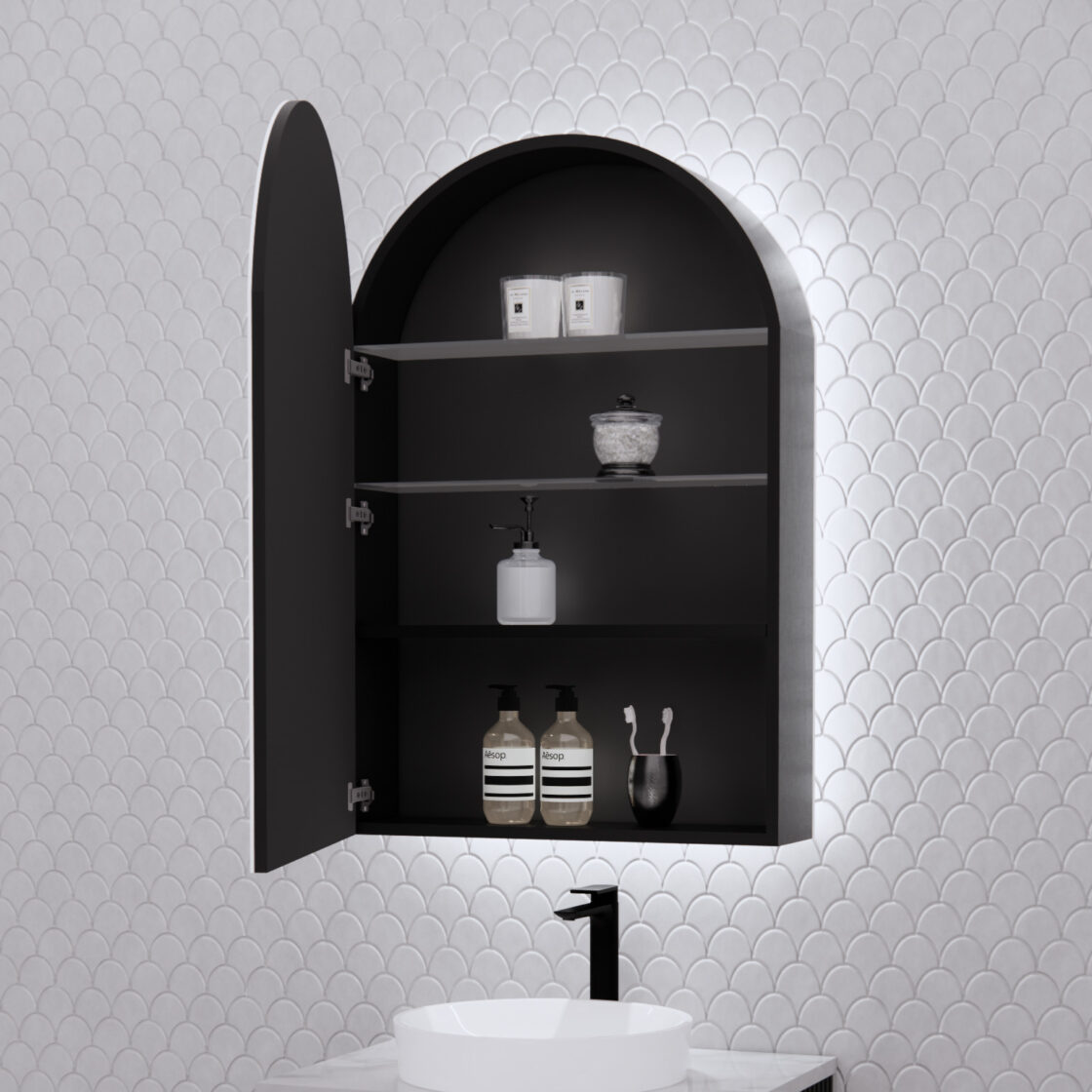 Riva Arch | LED Backlit 600mm Mirror Matte Black Shaving Cabinet